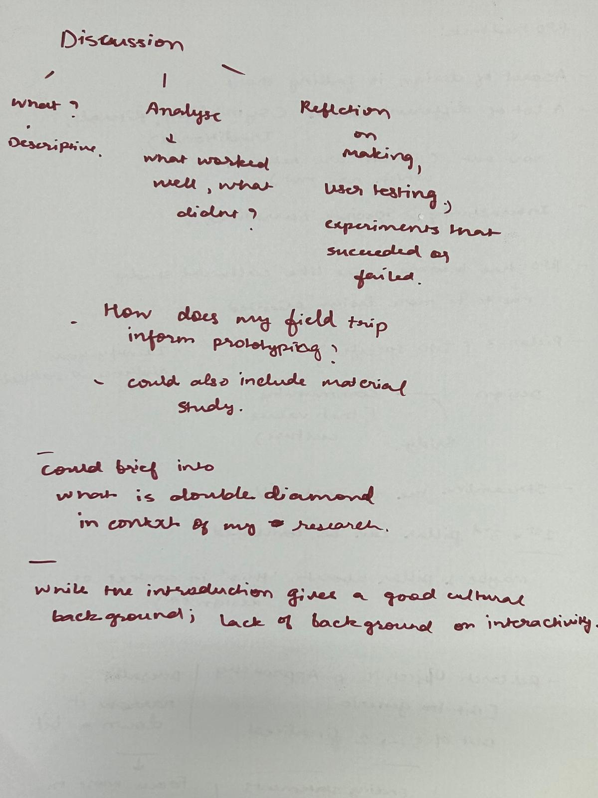 After doing this activity, I was thinking that maybe I specifically decided what my final outcome could look like without exploring and experimenting first. And also to not be so stuck on a ‘totally non-digital’ outcome. Maybe I should open my mind about what my final outcome could look like and experiment more and will be able to figure things out as I progress.