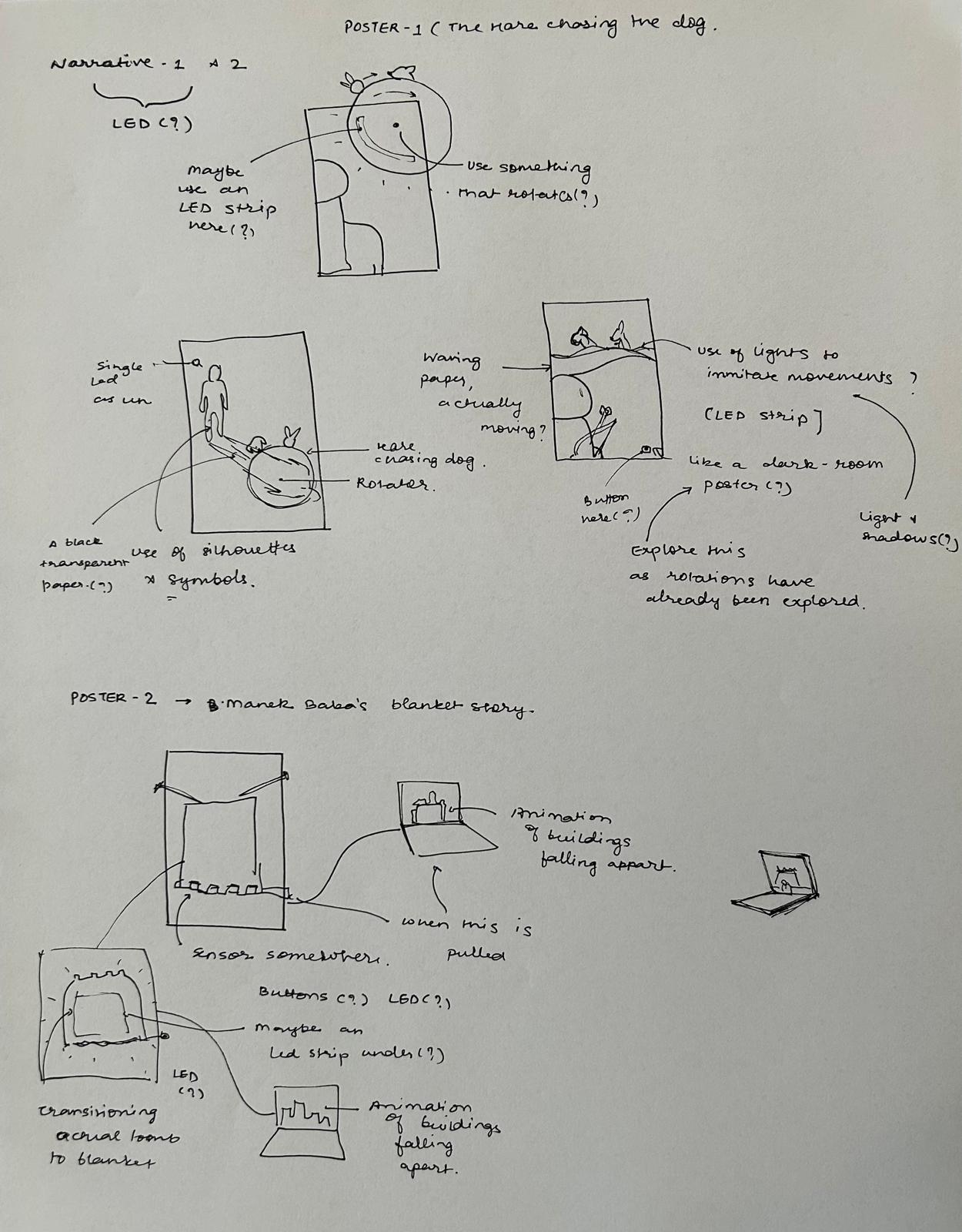 Over the weekend there were a few thoughts in my mind that I later sketched on a sheet, I had imagined myself experimenting and there are a few challenges here is that neither of the narratives includes a significant use of LEDs, so how do I experiment.