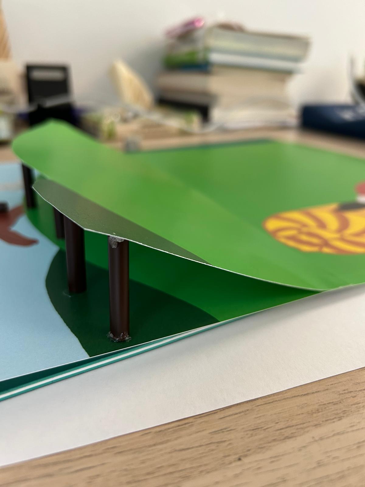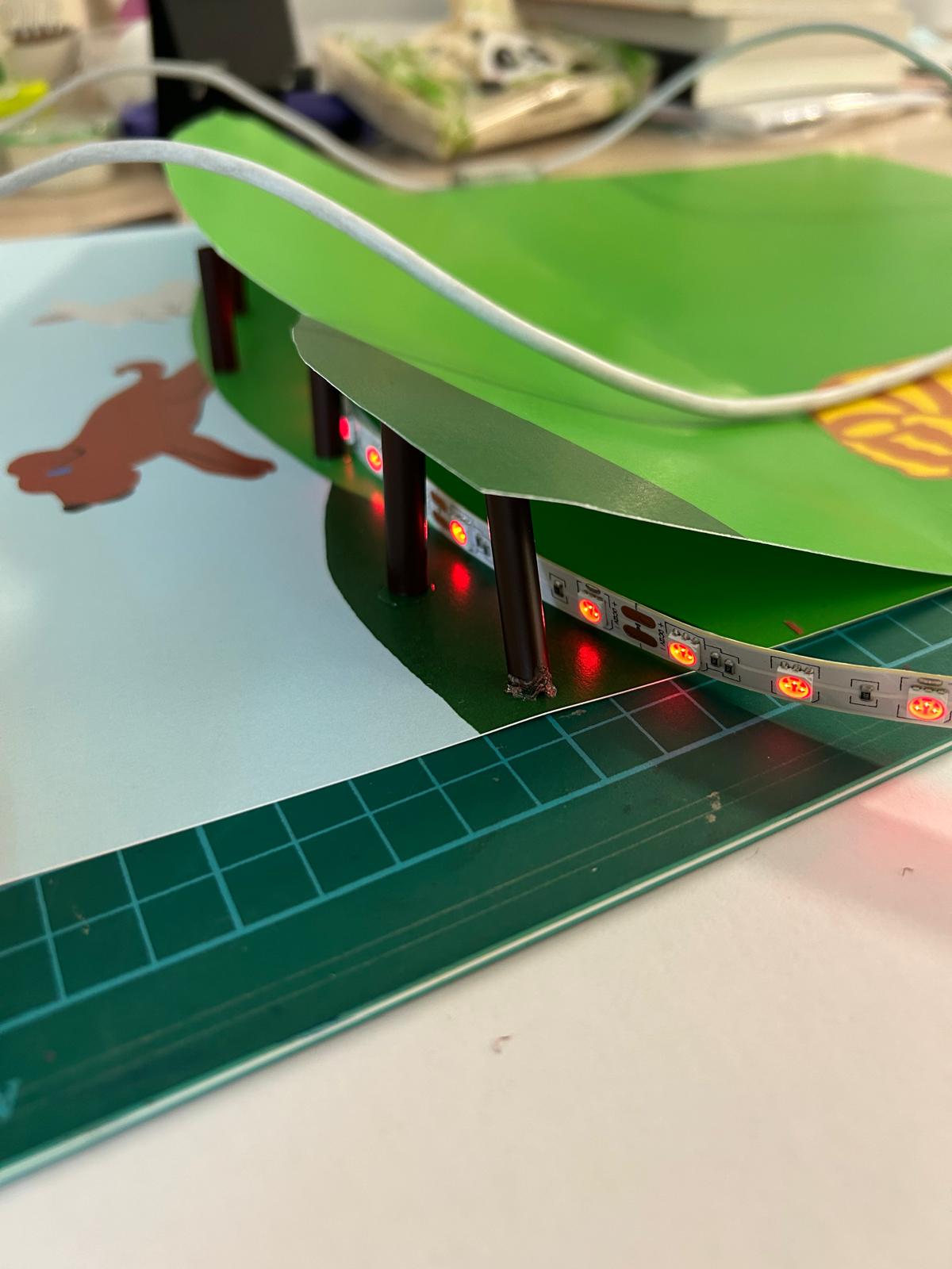 My focus wasn't much on illustration or visual aesthetics as I was more focused on the technical part. Once I was done crafting the poster, first I realised that I could habe made the hare and the dog bigger in size so that they are more visible.I wasnted to fit the LED in the empty space of the poster and I had glued cut-up pieces of straw to get shadows. The aim was to see if moving light and shadows simulate a movement.
