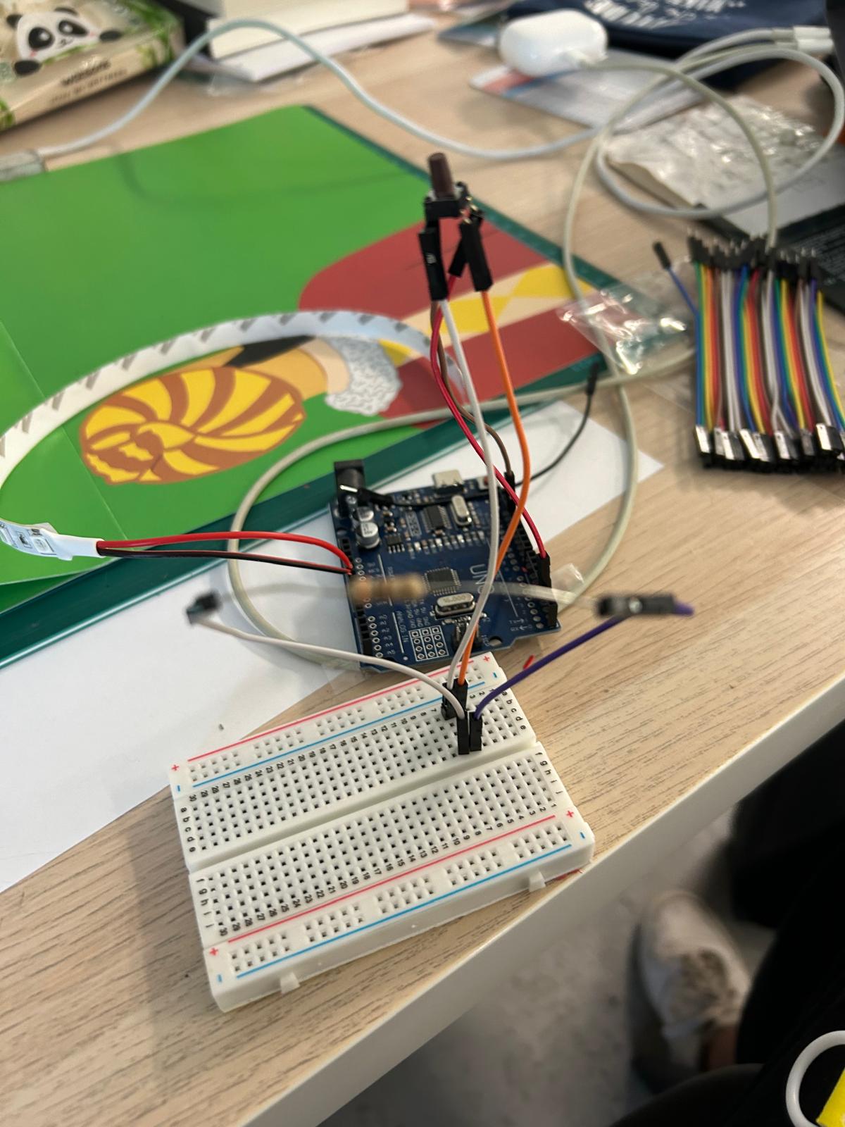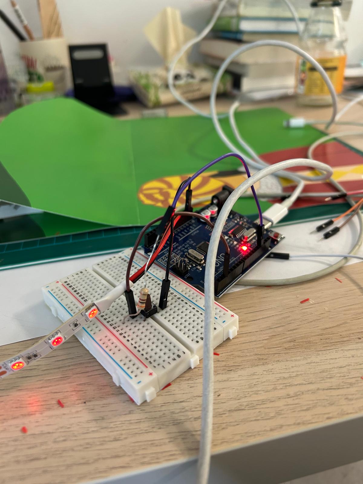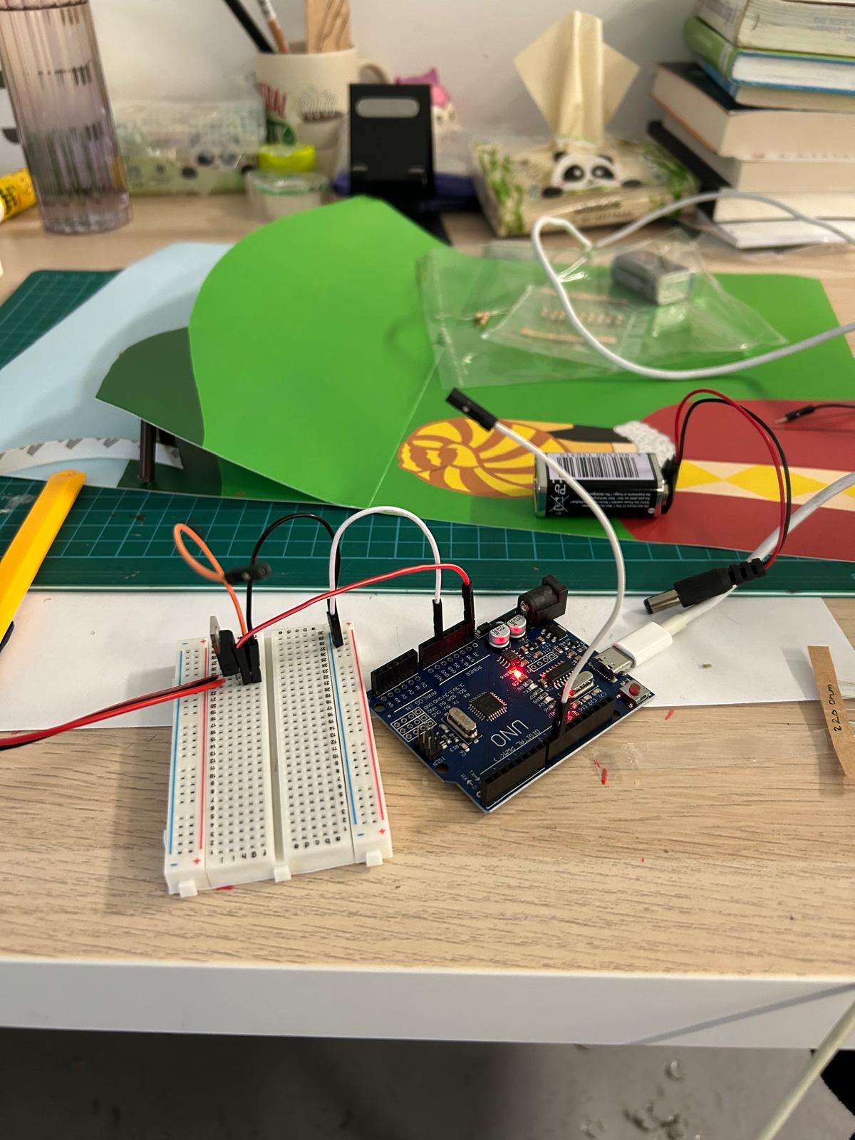 The LED would light up but it won't create a light movement. So I searched it up and realised that maybe the LED needs more power. The lady at the electronics store gave me 9v batteries so that the LED has enough power. It did not work. And I got pretty overwhelmed by then. What actually happened was the arduino heated up to a concerning extent so I put it off and didn’t continue to work on it for the day.