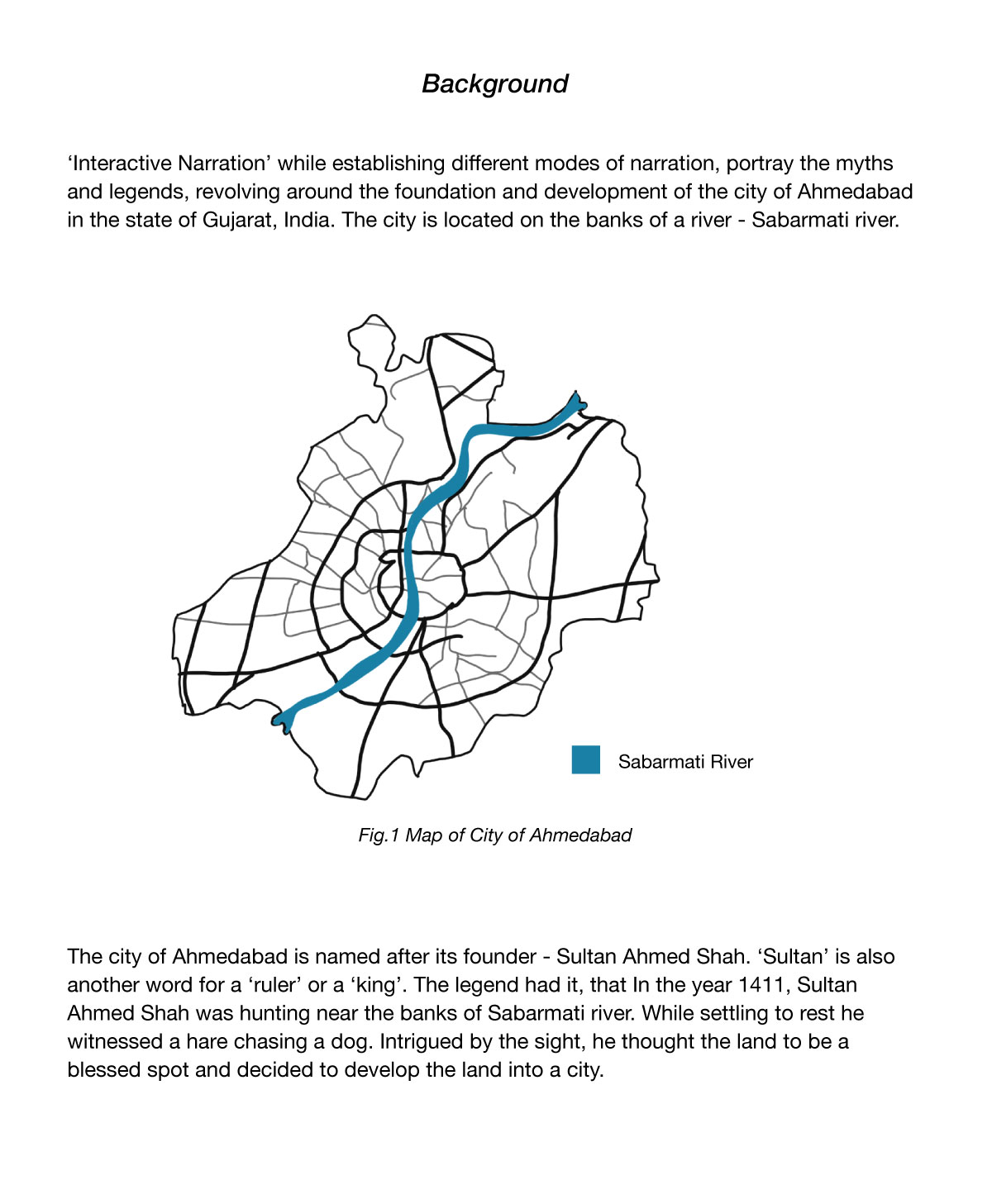 - ‘Interactive Narration’ while establishing different modes of narration, portray the myths and legends, revolving around the foundation and development of the city of Ahmedabad in the state of Gujarat, India. The city is located on the banks of a river - Sabarmati river.