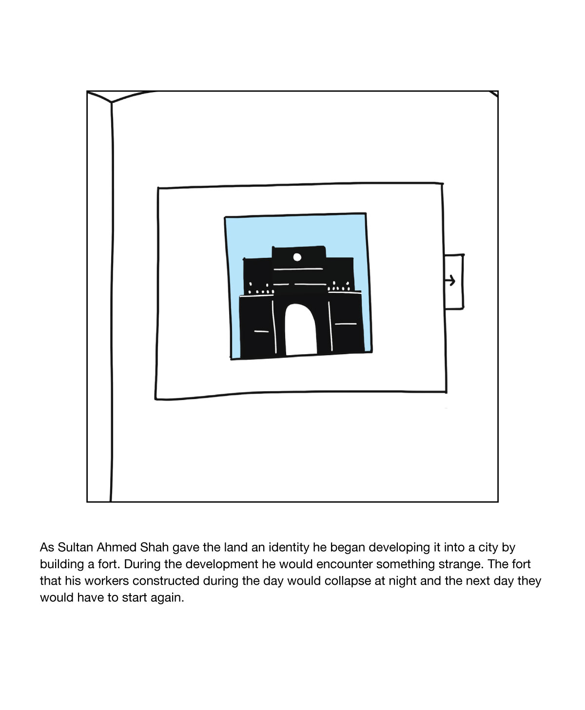 - (Image of page 1) As Sultan Ahmed Shah gave the land an identity he began developing it into a city by building a fort. During the development he would encounter something strange. The fort that his workers constructed during the day would collapse at night and the next day they would have to start again.