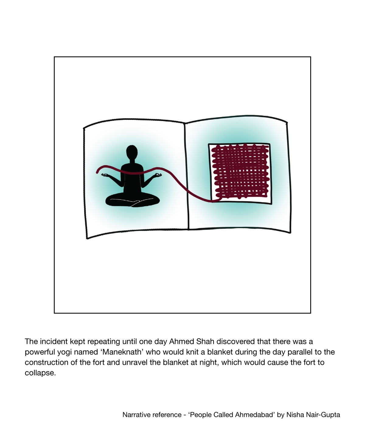 - (Image of Page 2) The incident kept repeating until one day Ahmed Shah discovered that there was a powerful yogi named ‘Maneknath’ who would knit a blanket during the day parallel to the construction of the fort and unravel the blanket at night, which would cause the fort to collapse.