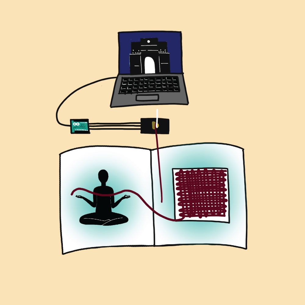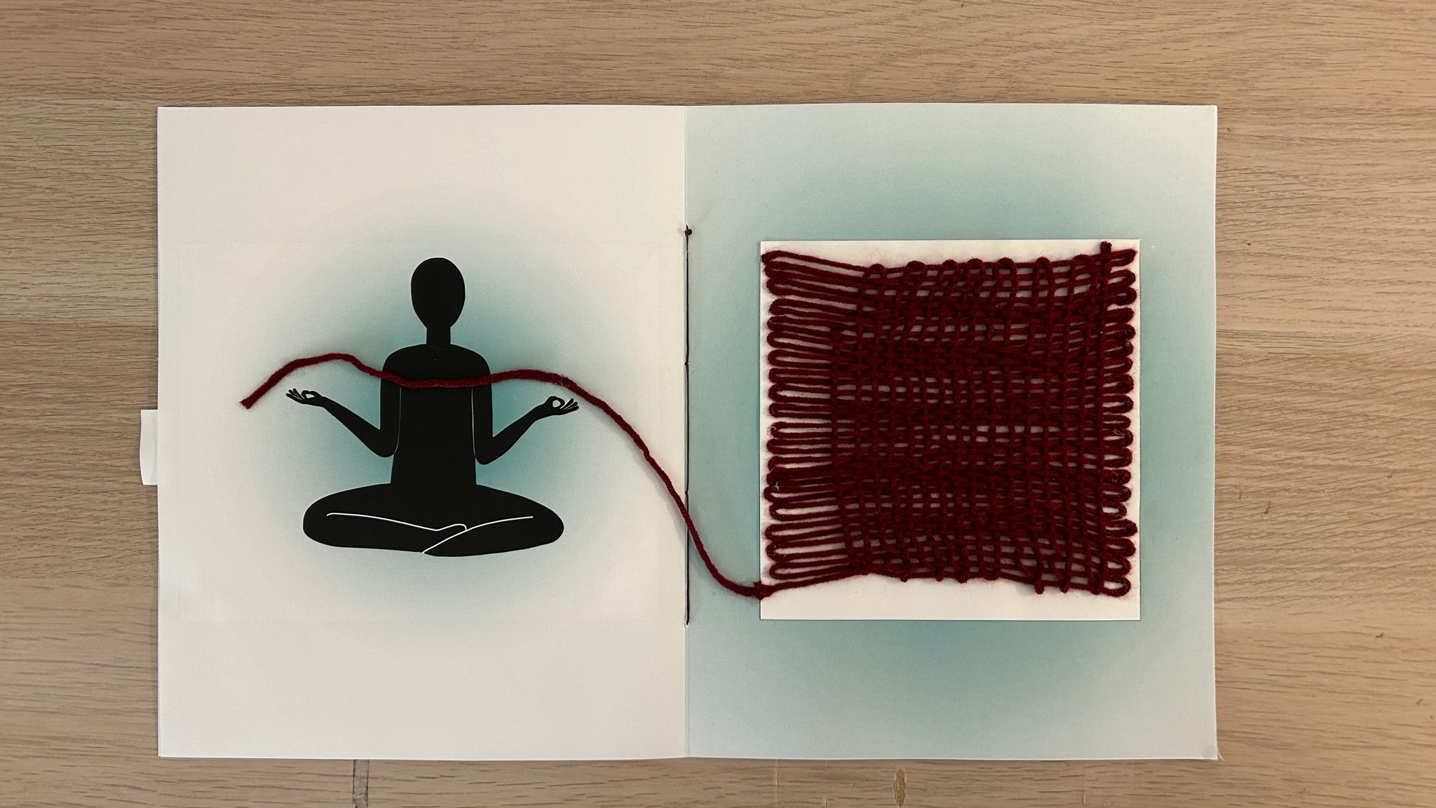 For the second page I had to portray someone meditating and the page next to it would have strings placed together looking like a cloth. One string from that, would reach out to the silhouette of a person meditating to show that he is doing something to the blanket.