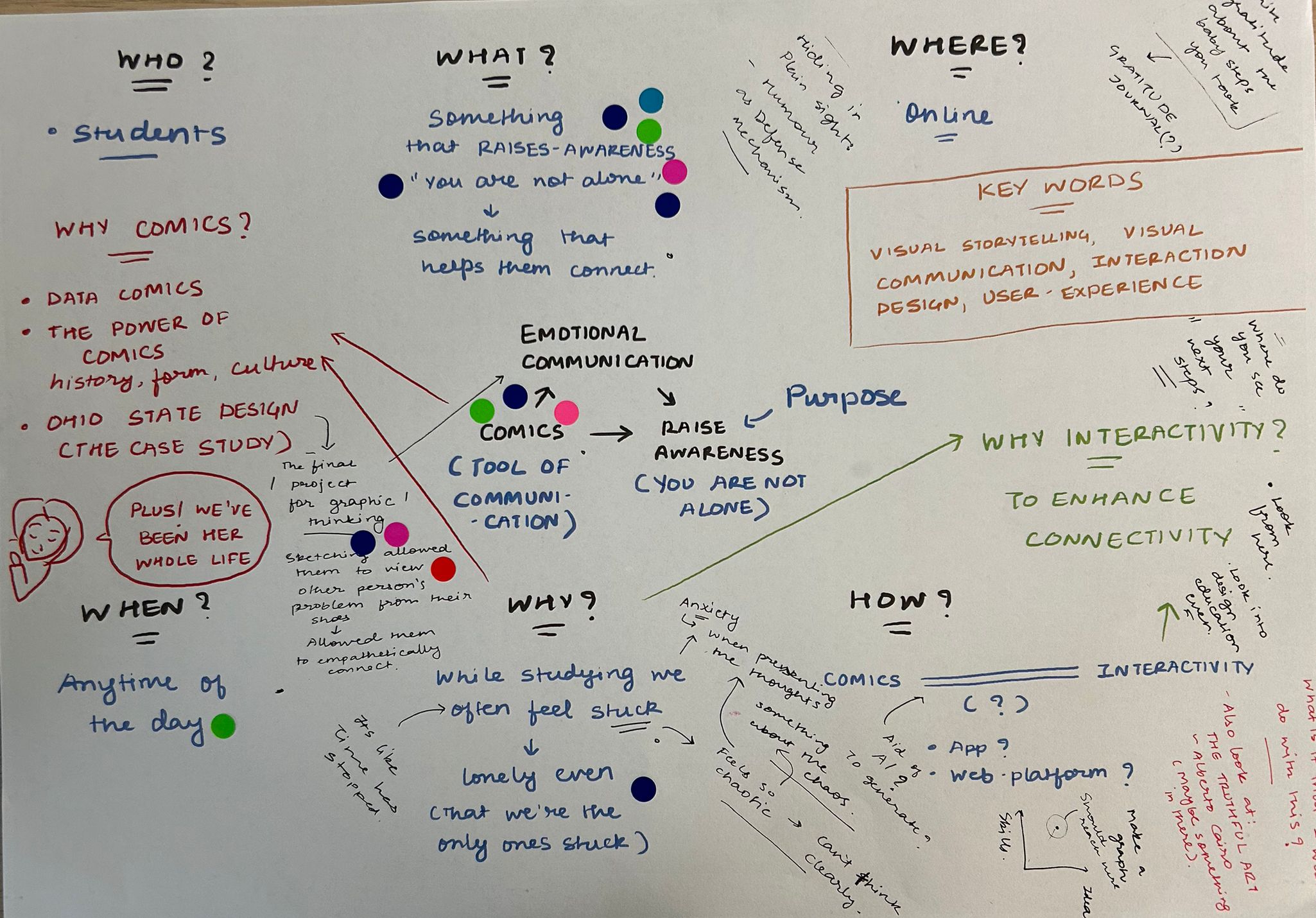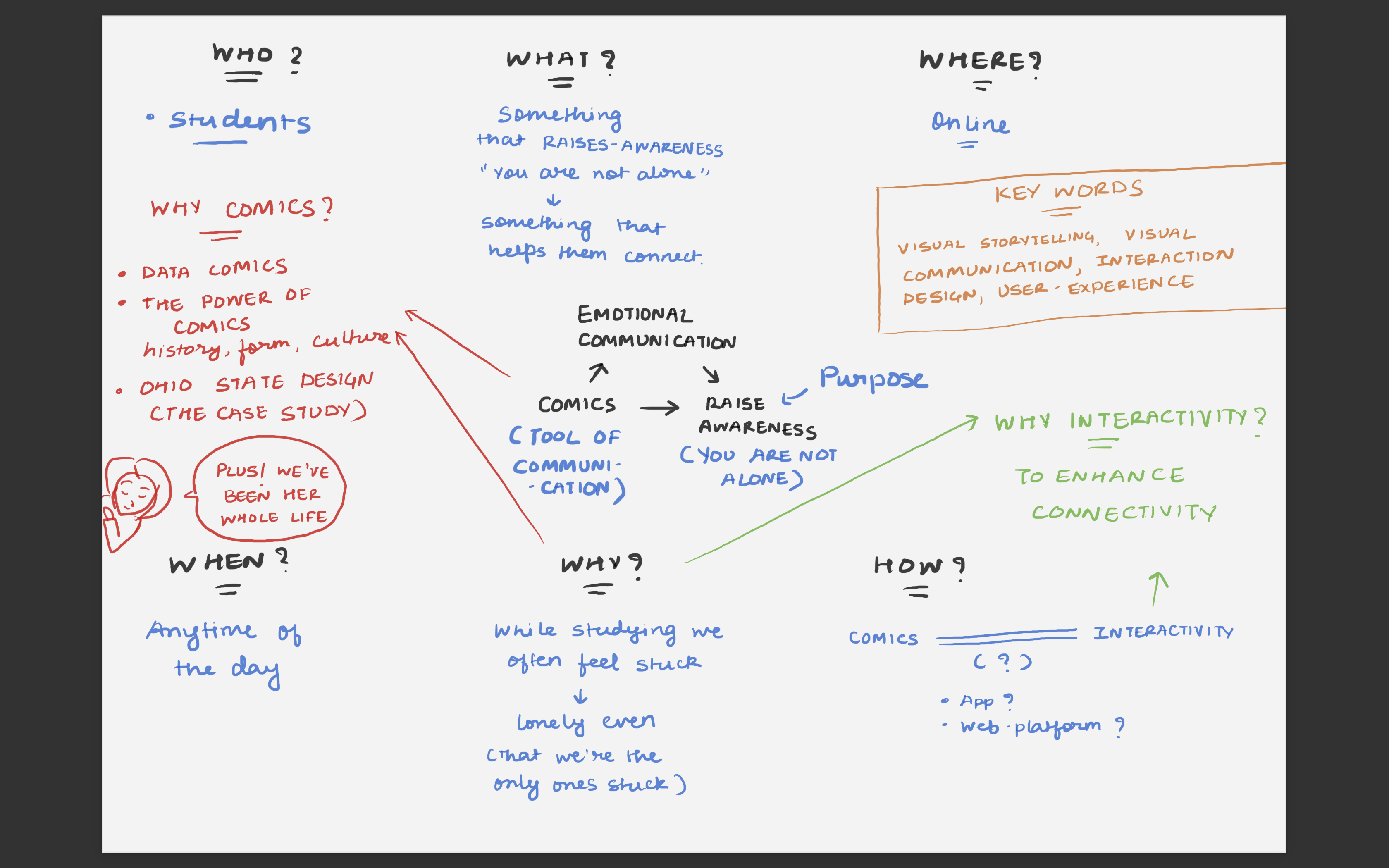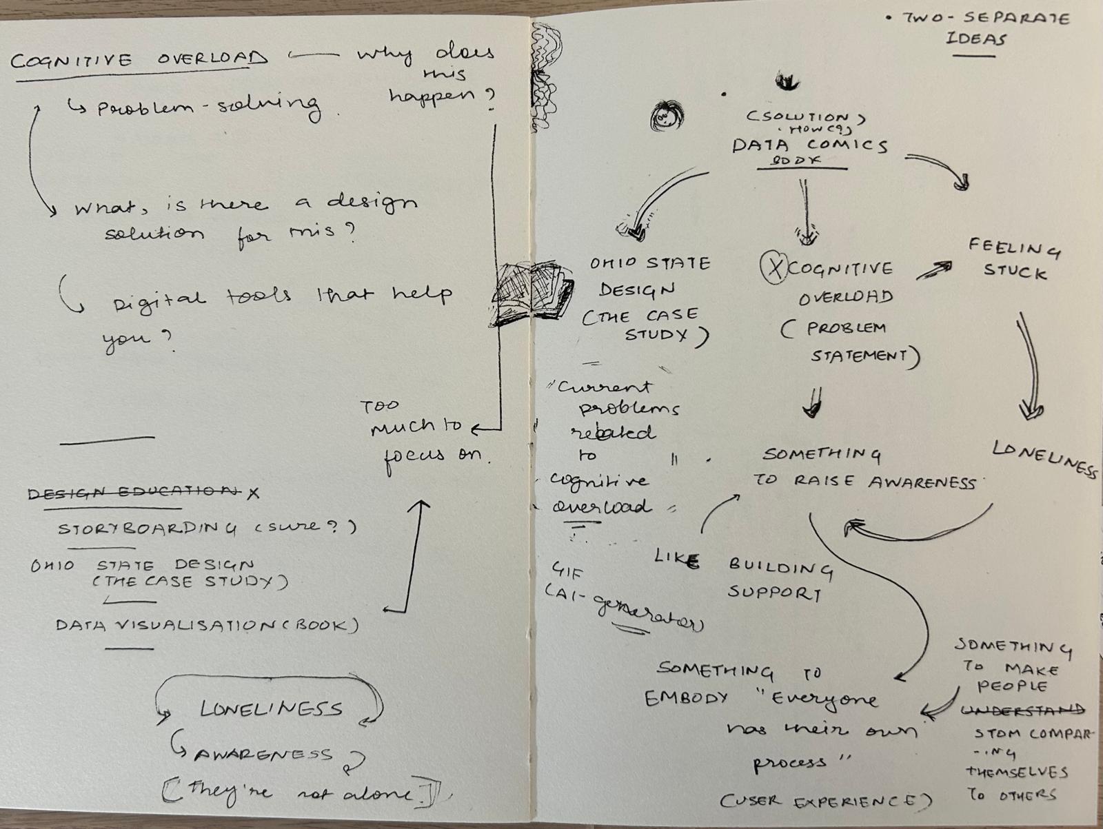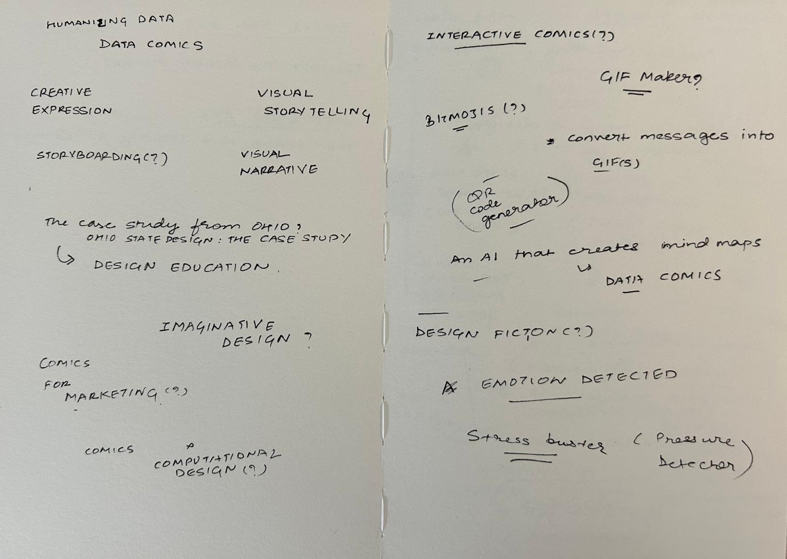 So I just took out my book and started writing any keywords or thoughts that would come to my mind: I started with ‘Data Comics’, a JSTOR article that I had found when I was looking for visual storytelling. After that I just started writing anything that came to my mind.