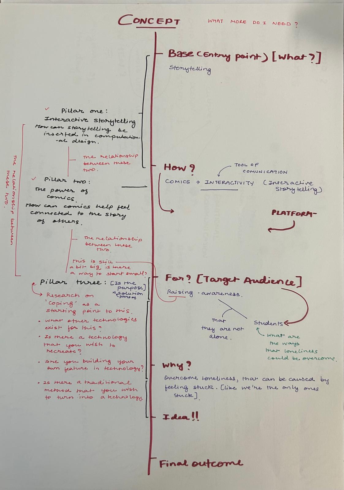 There was actually quite a lot going on in my mind, there was a point where I even started thinking about ‘cognitive overload’ and finding a design solution but then I ended up thinking about stress and loneliness that can be caused by it and then I refined my mind map a little. I did have some things in mind but I was not able to put them into words.