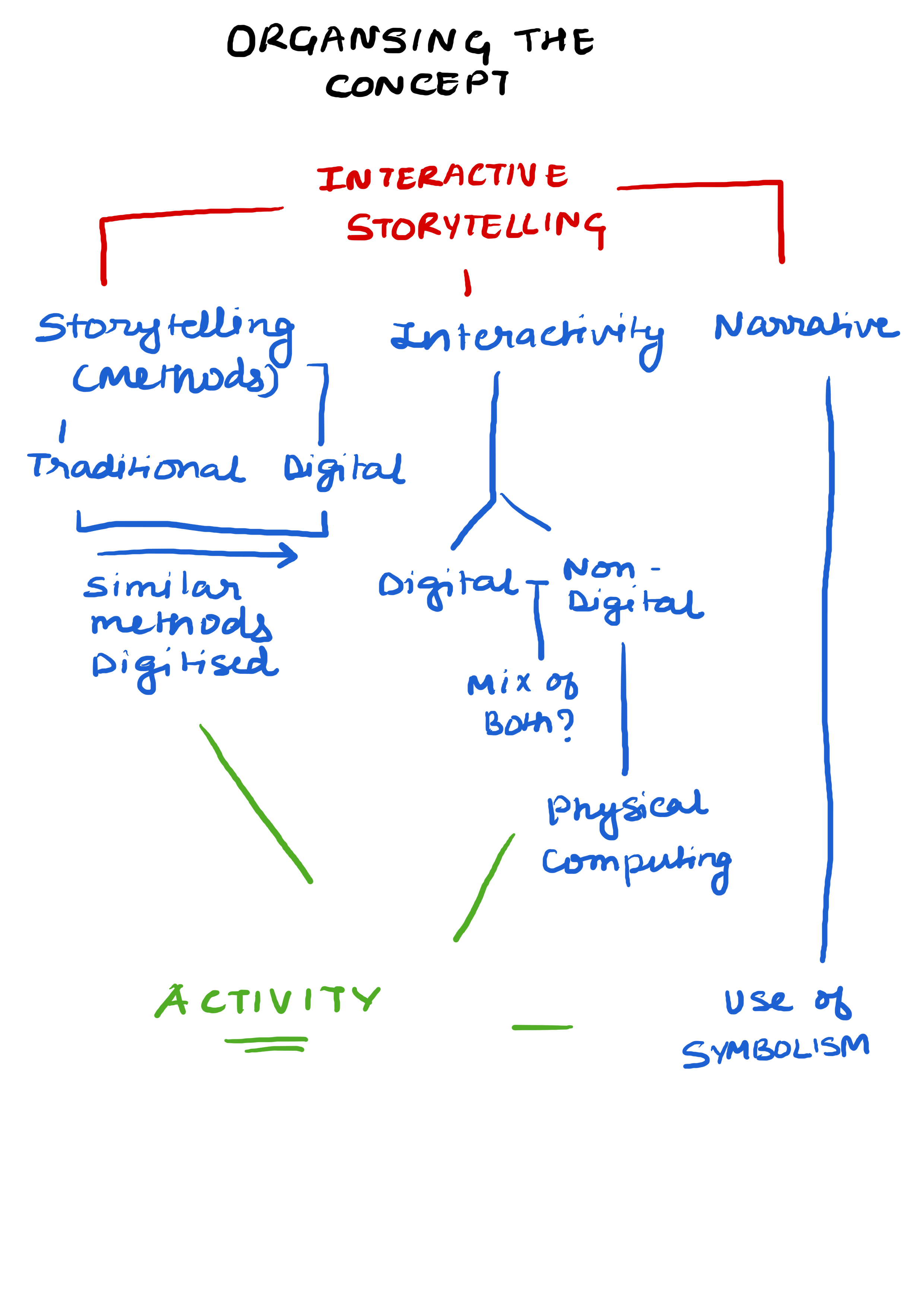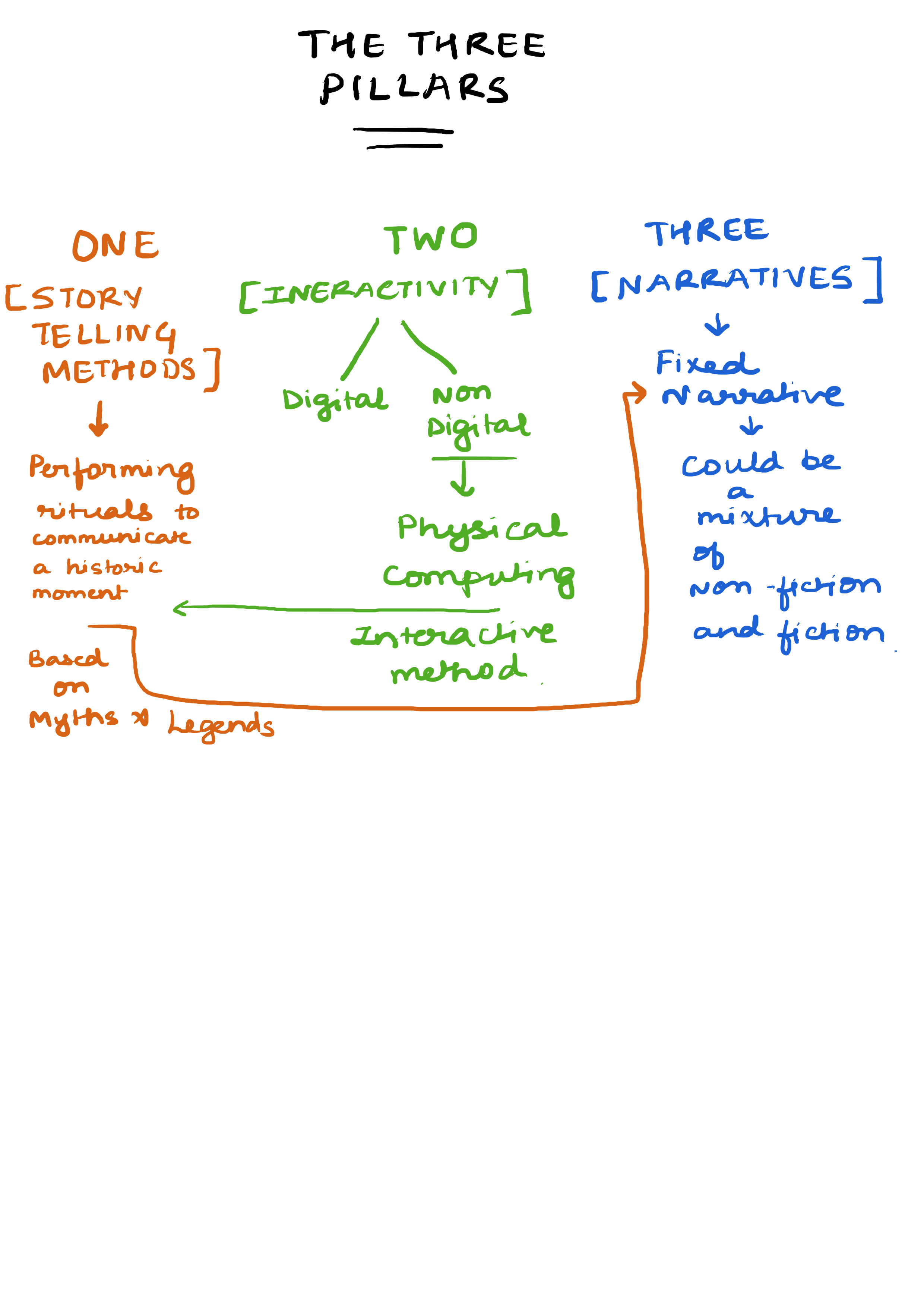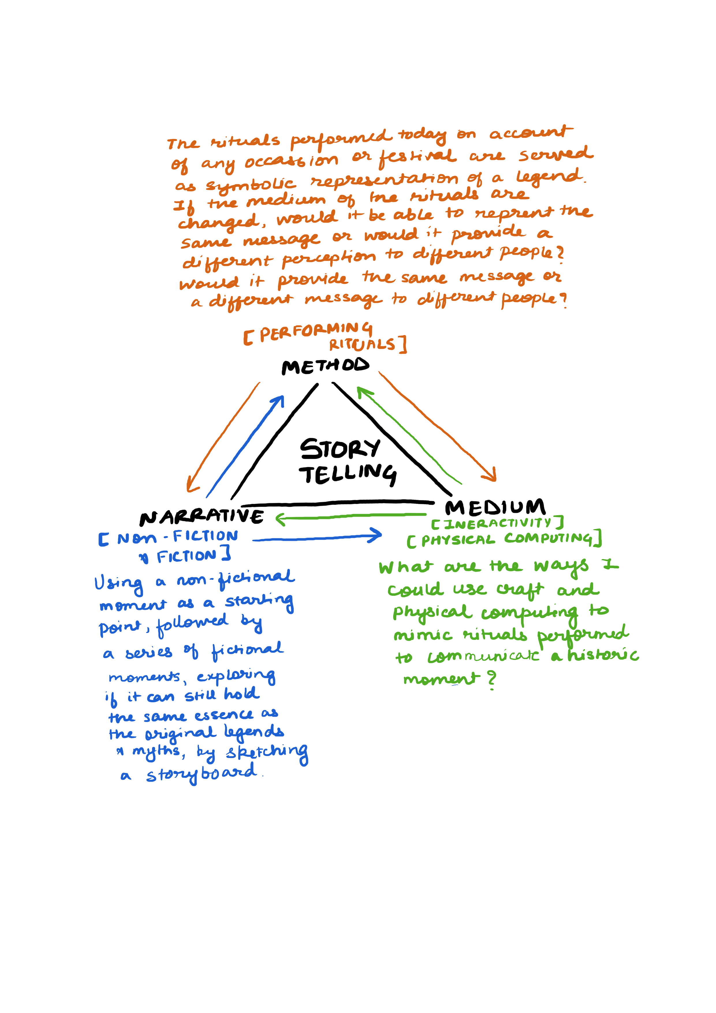 I haven’t researched further however this mind map contains my current state of research questions according to each pillar or would I say further points of exploration to each pillar. I plan on doing another activity. Previously I conducted an activity that had its focus on interactivity. Now I plan on exploring an activity based on Narrative, storyboard a narrative, starting with a non-fictional moment and just naturally sketch and see how I unfold a narrative and to what. Which also brings another question to my mind: “Some of the practices involved in the legend are based on beliefs of the time, will the beliefs of current time influence the essence of the storyline?” - It may be a bit vague but I also want to explore how current beliefs influence the essence of the symbolic representations.