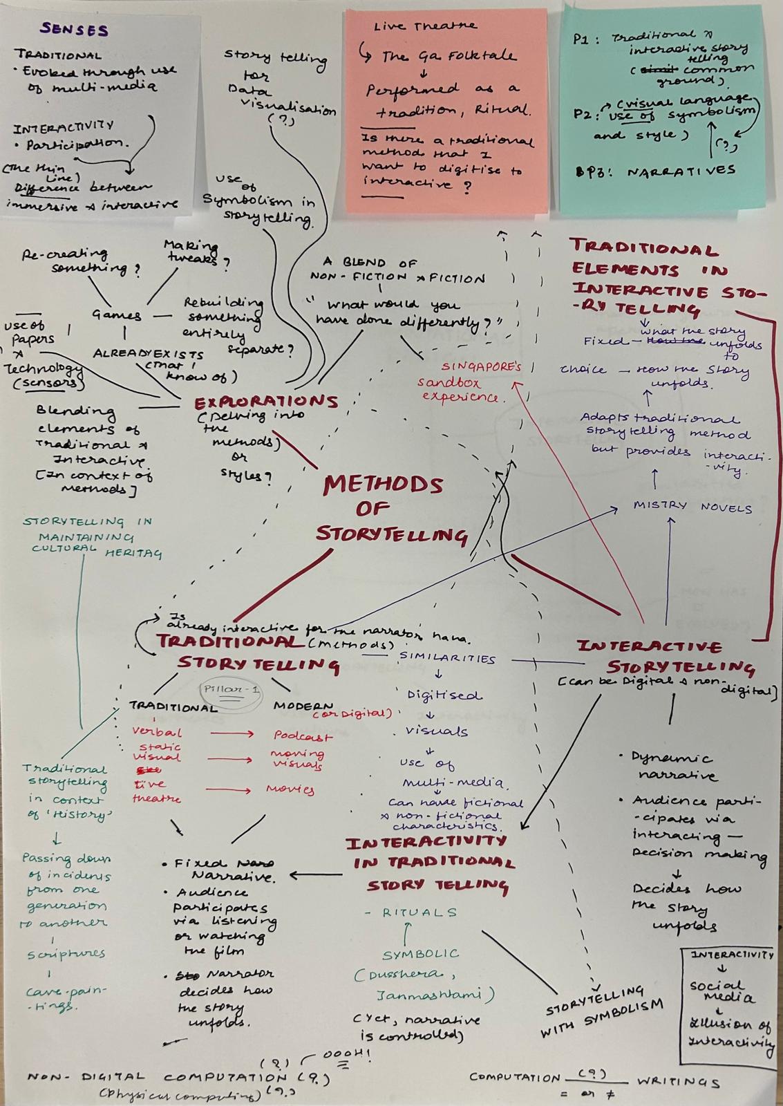For the third pillar, I kept it for purpose and solution and asked myself a few queComing back to the research concept, I encountered another question: “is it the narrative that I want to be interactive or the method?”. My next goal now is to also give more structure to the three pillars with more research and critical thinking. And first write the introduction part of my RPO which may also be an indication that I now have achieved complete clarity. Currently, I am unable to explain my concepts without the aid of my concept maps. I believe if I am able to write the introduction I would gain complete clarity on how to explain my concept. So I decided to make another mind map of my current knowledge and form research questions or sentences.