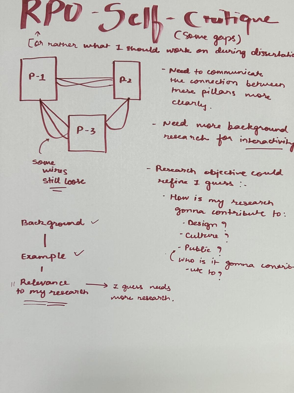 After the RPO I made a list of things that I thought were missing or could improve in my RPO. Or could be used as notes for dissertation. These were some things I observed while writing the RPO and after submitting it. As notes of what could be taken care of during dissertation. I also want to refer to more readings maybe because some of the areas in the research are still a bit unorganised in my thoughts, like the connection between each pillar. For now I thought I should also think about what I want to do for studio work. And I wanted to explore the arduino for which we have a workshop this wednesday, 9th October 2024.